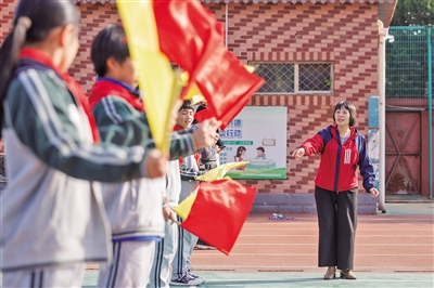 跨过水峪嘴村的桥,再向北走几百米路,便是妙峰山民族学校。在操场上,学生们正在进行“安全演练+民族体育”特色的大课间体育活动,几百个孩子根据自身兴趣选择运动项目,有舞龙舞狮的、有表演京西太平鼓的、有打篮球踢足球的。在操场一角,班主任付贵茹带着十个孩子在演练旗语。
