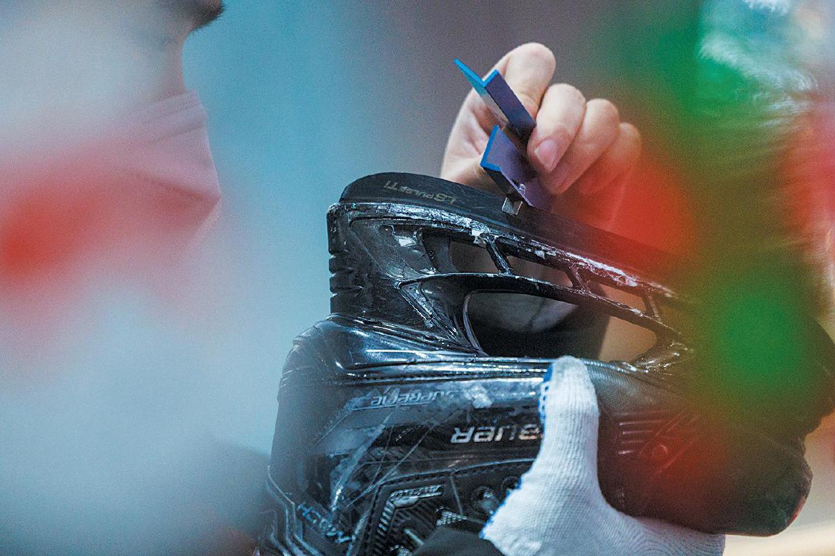 2024年12月13日,枫峤冰场,工作人员正在打磨吴博霖的冰刀。