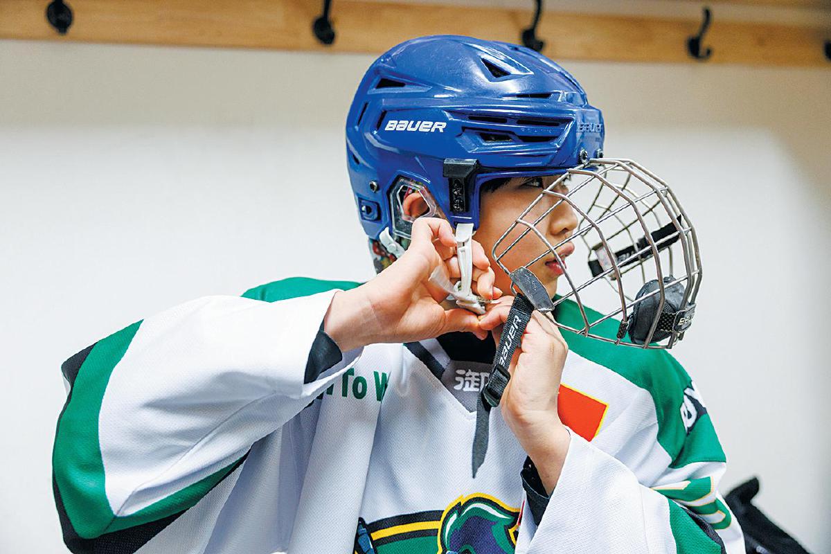 球员休息室里,吴博霖和队友穿着形如铠甲的护胸,认真听来自加拿大的教练部署战术。即将上场,教练一边热情地拍一拍每一个球员的肩膀,一边说:“兴奋起来,享受比赛!”吴博霖有些腼腆地以笑容回应。