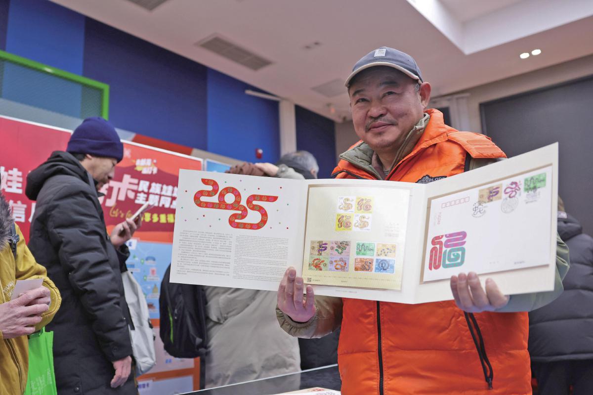 1月5日,北京市朝阳区邮票公司营业部,一位邮迷展示刚刚购买的《乙巳年》同题材小全张。当日,《乙巳年》特种邮票正式上市发售。中国邮政携手港、澳邮政部门共同印制的生肖同题材邮票三地小全张同日发售。 新京报记者 李木易 摄