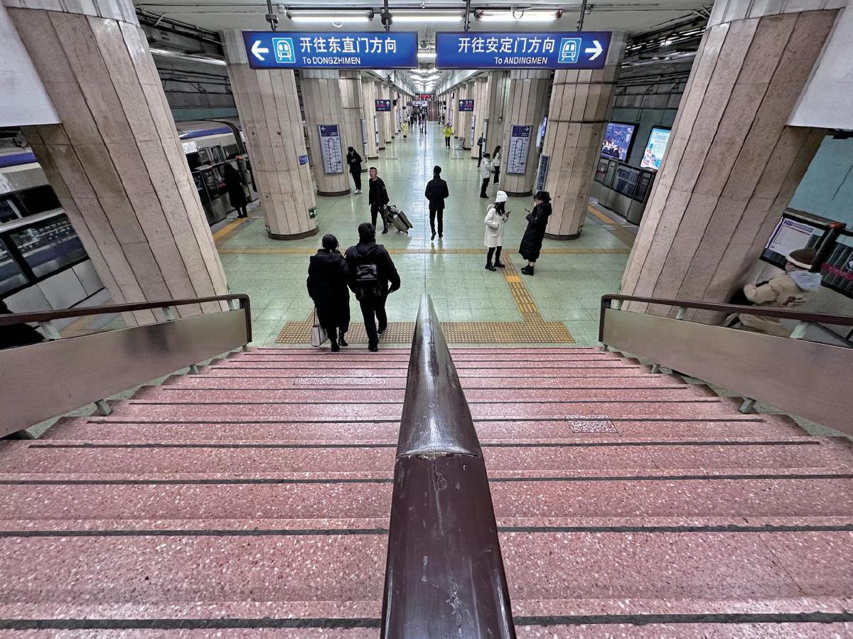 1月3日,地铁2号线雍和宫站,该站台阶为红色的石砖,每一级台阶上都有黑色的橡胶材质的防滑条,色彩对比明显,使得台阶边界十分清晰。
