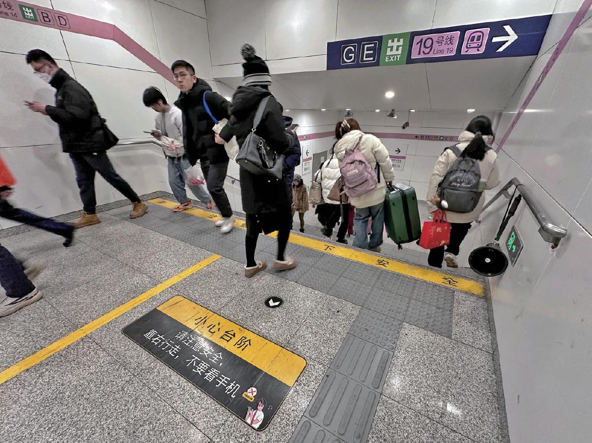 1月3日,地铁景风门站14号线与19号线换乘通道内,通过文字、语音广播和警示条等方式,提醒乘客通行台阶时注意安全。