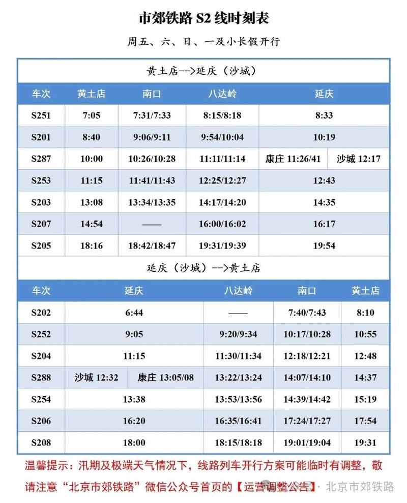 北京市郊铁路官微1月13日发布运营调整公告:2025年春运期间(1月14日至2月22日),S2线执行高峰期列车开行方案,每日开行7对列车,具体列车时刻表如下:
