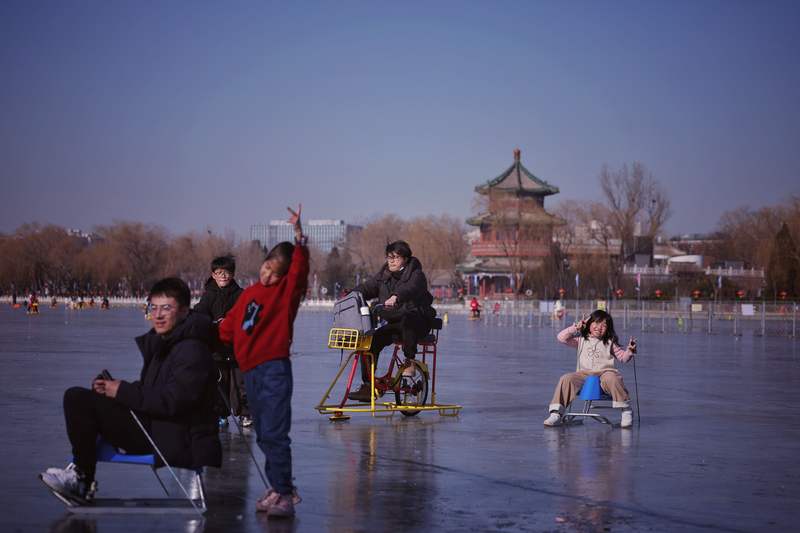 1月17日早晨,什刹海后海冰场开业,几名游客在冰面游玩。新京报记者 薛珺 摄