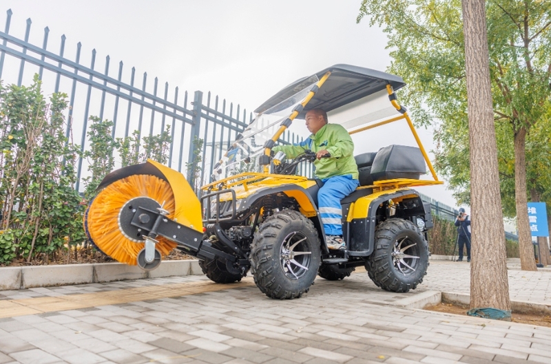 小型多功能除雪车(摩托式)由沙滩摩托车改装而成,具有体积小、操作灵活等优势,能够在辅路和人行道之间进行转换作业,清理积雪。