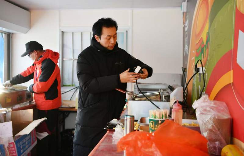 赵双乐检查冰雪嘉年华内餐饮用电安全。新京报记者 薛珺 摄