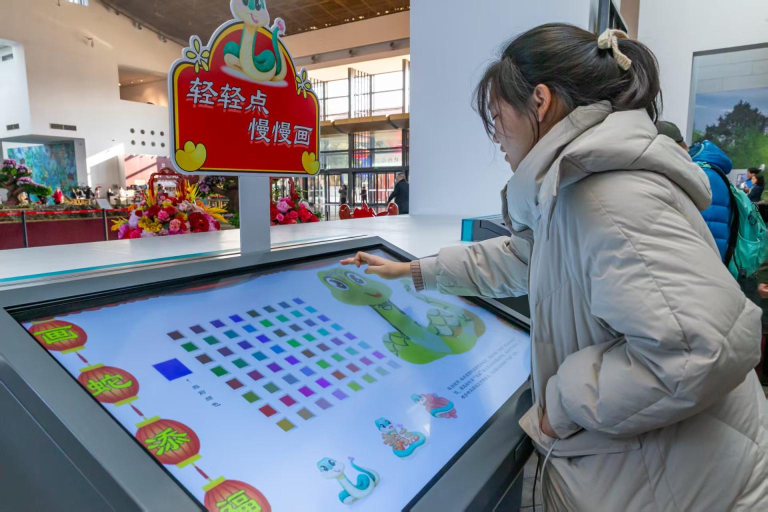 北海公园年宵花展导览科普活动吸引众多游客赏花识花。北京游客李女士表示:“活动寓教于乐,非常棒。”同时,“吉庆年年”生肖设计大赛邀请展上,生肖蛇的创意设计令人眼前一亮,内蒙古游客孙先生对此赞不绝口。