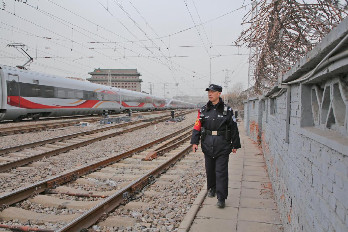 北京铁路公安局北京公安处北京站派出所驻场民警郑涛在巡线。北京铁警供图