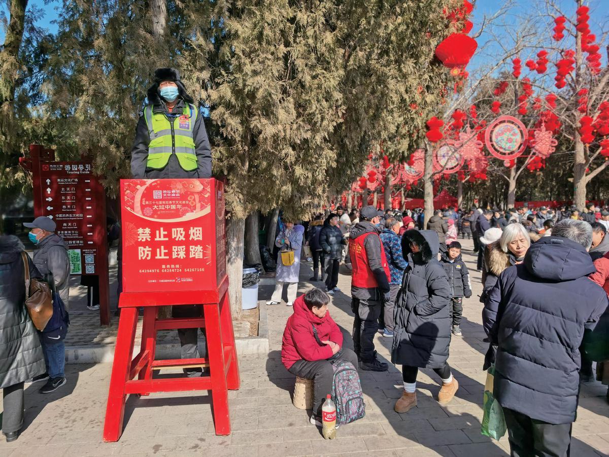 2月4日,地坛公园庙会现场,工作人员在瞭望台上观望,时刻关注游客人流情况。 摄影/新京报记者 陈琳