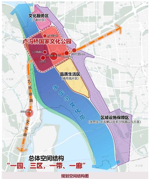 “一园”指卢沟桥国家文化公园。“三区”指北部布局文化休闲功能的文化服务区,南部重点补足服务设施短板的品质生活区,永合庄-北天堂以及丰沙铁路以东集中布局重大交通和市政基础设施的区域设施保障区。“一带”指依托永定河,串联沿岸文化资源和滨河公园,打造融合文化休闲和生态游憩功能的永定河文化带。“一廊”指依托九省御路,串联卢沟桥-宛平城、赵登禹将军墓以及长辛店老镇等历史文化资源,打造展示古都风韵的九省御路文化廊。
