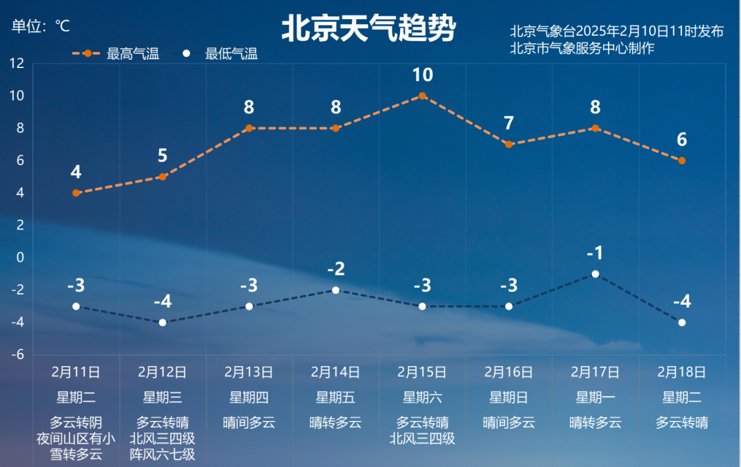 预计2月11日至18日,白天最高气温4~10℃,夜间最低气温-4~-1℃。