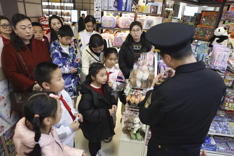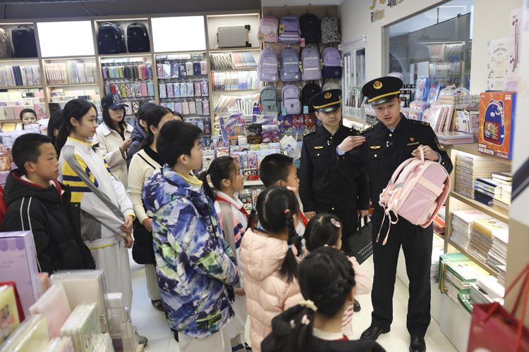 执法人员带领八一学校学生代表及家长,走进学生用品销售门店进行 “沉浸式” 执法体验与科普实践。