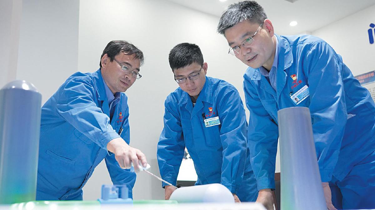 郭佳宁(左一)和同事们在创新工作室开展学习交流。