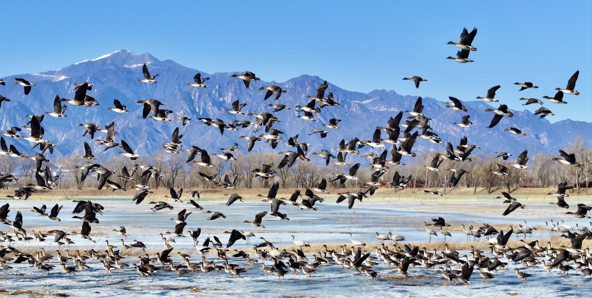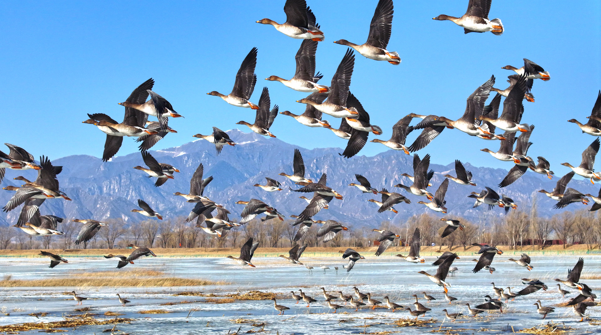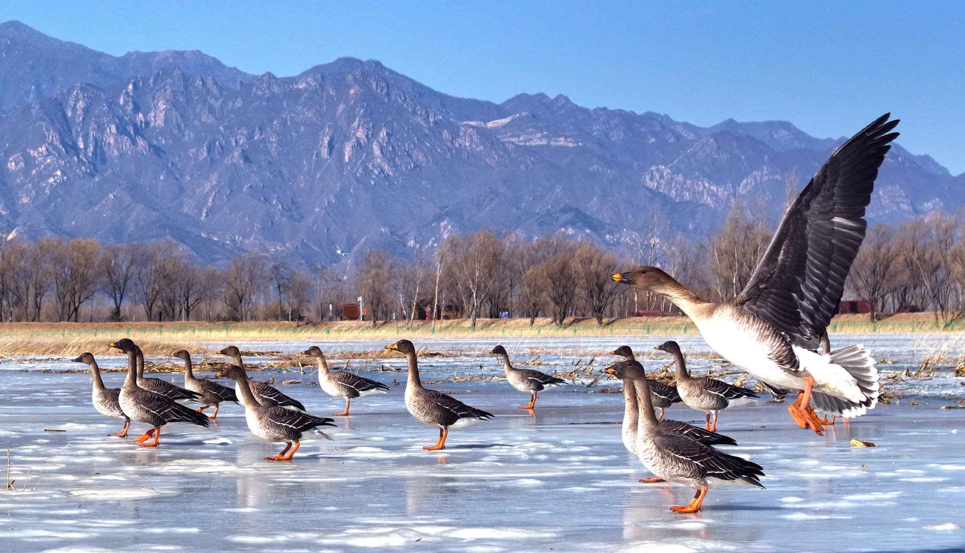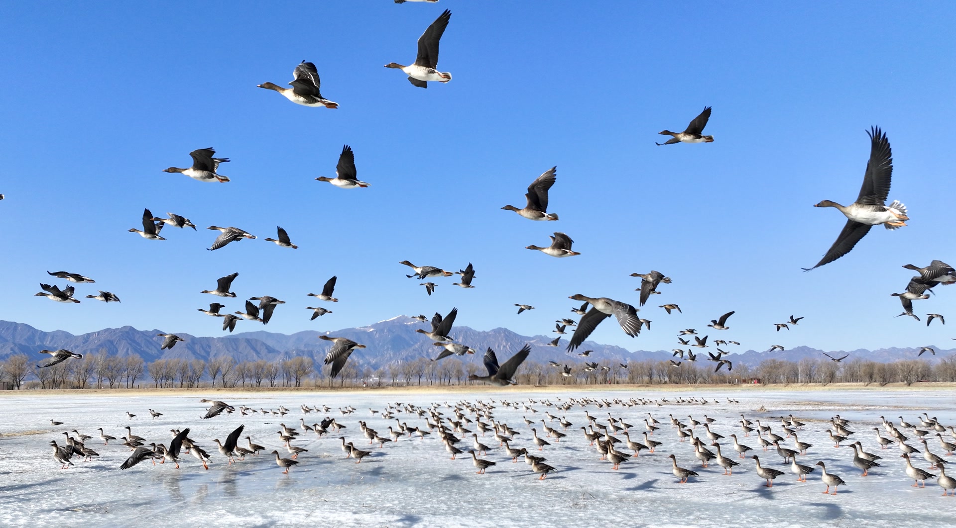 “八九”时节悄然而至,延庆野鸭湖湿地自然保护区内,春寒料峭,乍暖还寒。成群结队的大雁从远方归来,它们在冬雪残冰与蓝天碧水交织出的奇幻世界中翱翔、嬉戏,为这片静谧的湿地带来一抹初春的灵动与生机。
