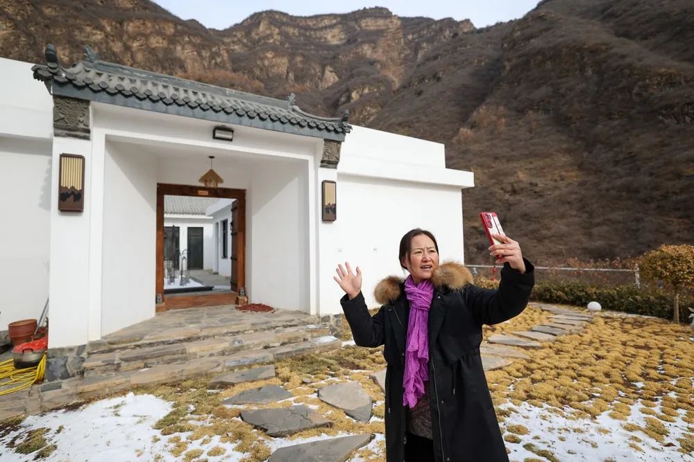 民宿经营者在天津前干涧村的自家民宿前用手机录制短视频进行推介。图源:新华社