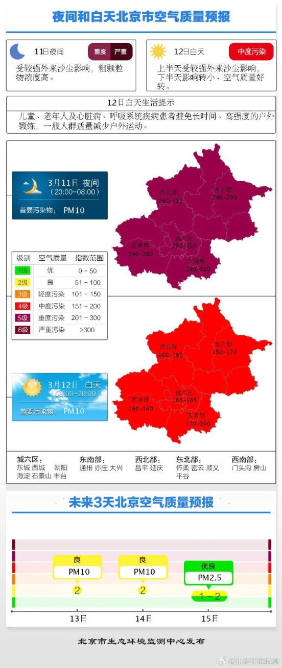 11日夜间,受外来沙尘影响,预计首要污染物为PM10,空气质量指数290-310,5-6级,重度-严重污染。