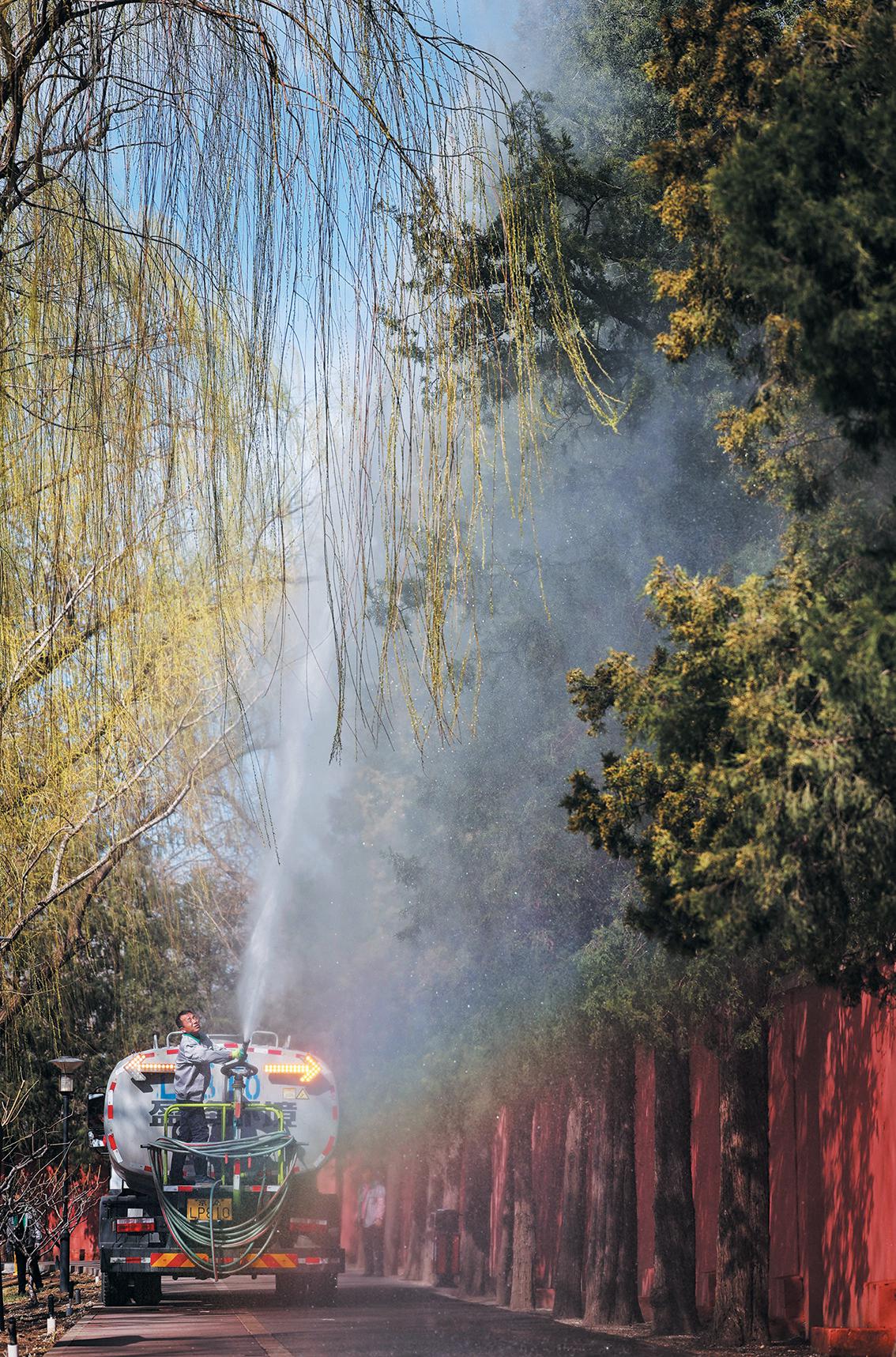 3月19日,红领巾公园,工作人员对路侧的桧柏洒水喷淋,以减少花粉飘散量。 新京报记者 薛珺 摄