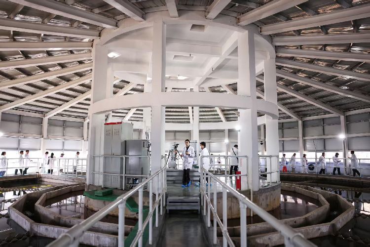 在石景山水厂,市民参观机械加速澄清池车间,直径25米的圆形池体正高效运转。
