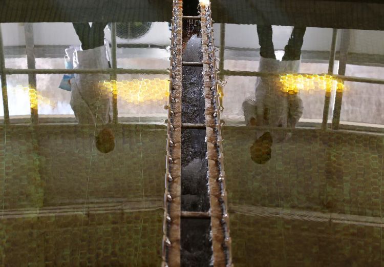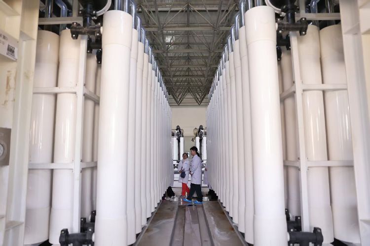 水在超滤膜车间经20组膜堆以0.02微米的孔径进行超滤,拦截悬浮物、微生物等杂质。