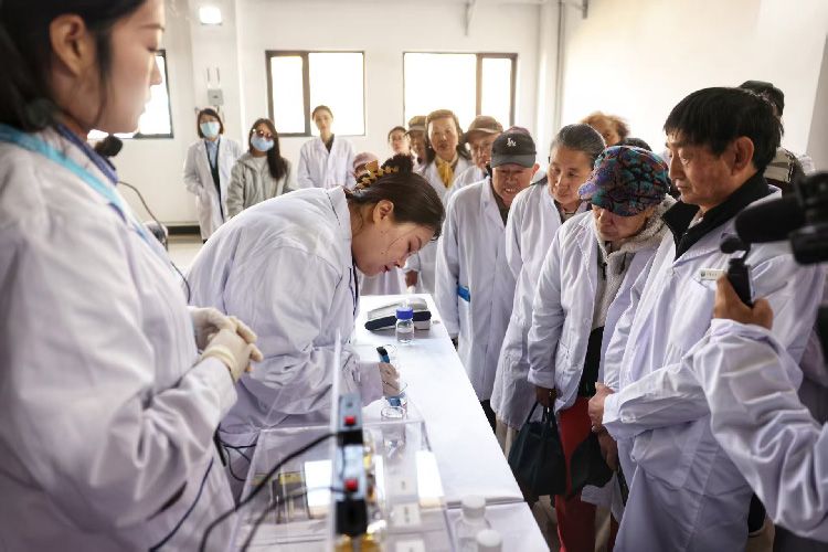 实验人员进行电解水、溶解性总固体检测等实验,向市民介绍水质知识。