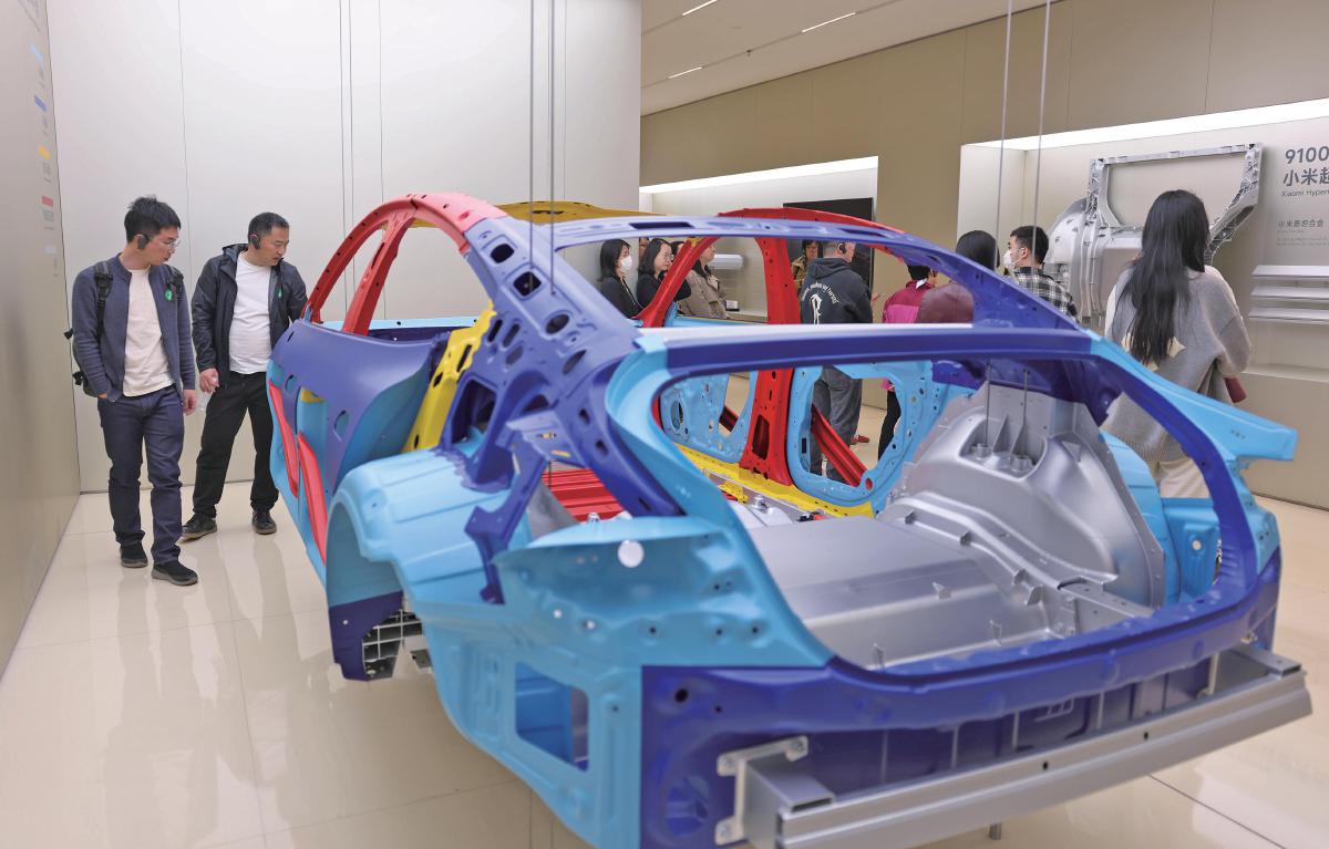 3月24日,近50位市民游客走进小米汽车工厂,近距离感受智能制造的魅力。当日,由北京经开区工委宣传文化部开展的“畅享科技·乐酷亦庄”科技馆之城系列特色活动——新能源汽车专场举办。图为科技展厅内,市民在欣赏小米汽车的车身结构。