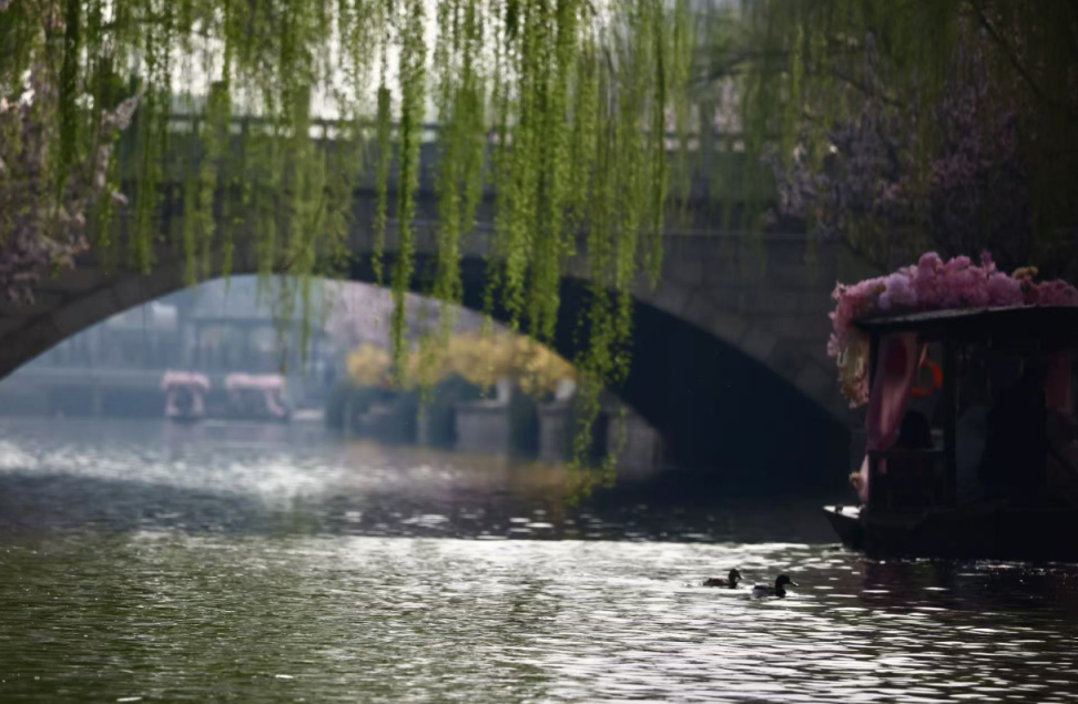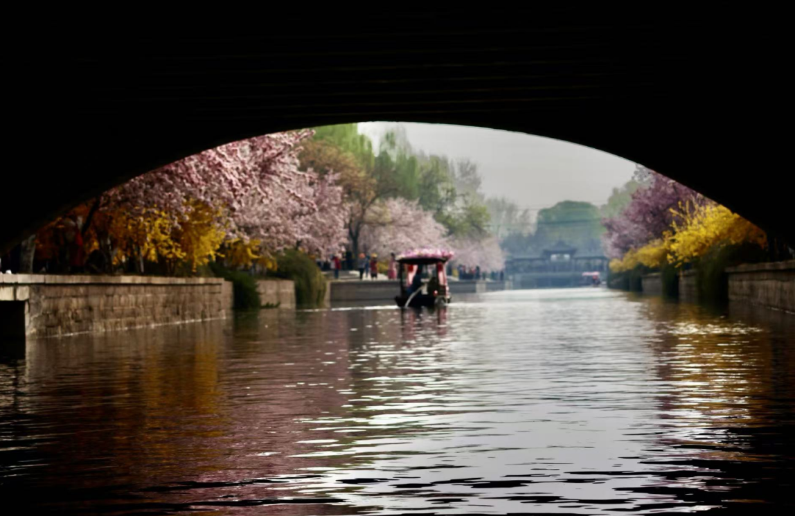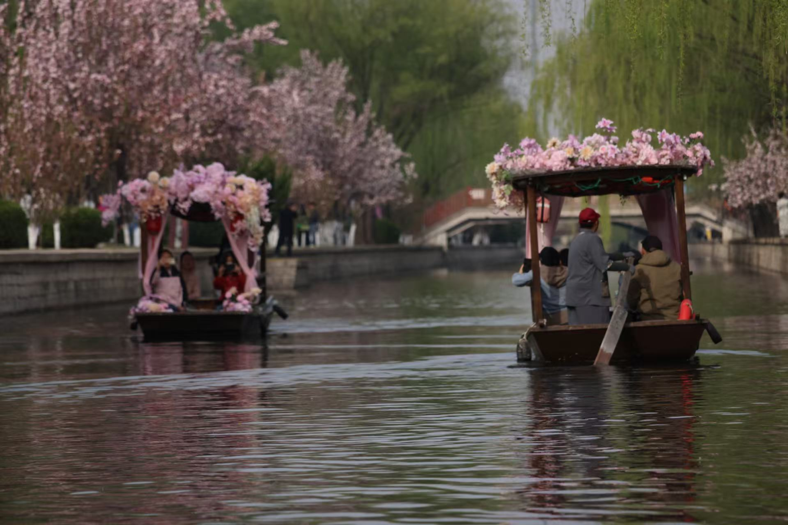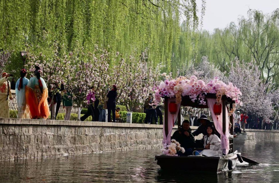 清明时节,北京元大都遗址公园的海棠花溪迎来了踏青赏花的高峰。游船上的游人观赏着两岸的美景,尽享这诗情画意的春色。