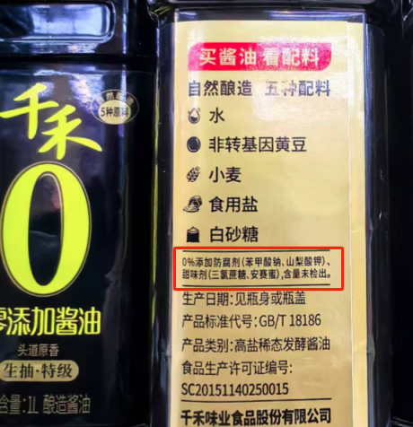 一款千禾0零添加酱油,实际指“0%添加防腐剂(山梨酸钾、苯甲酸钠)、甜味剂(三氯蔗糖、安赛蜜),含量未检出”。