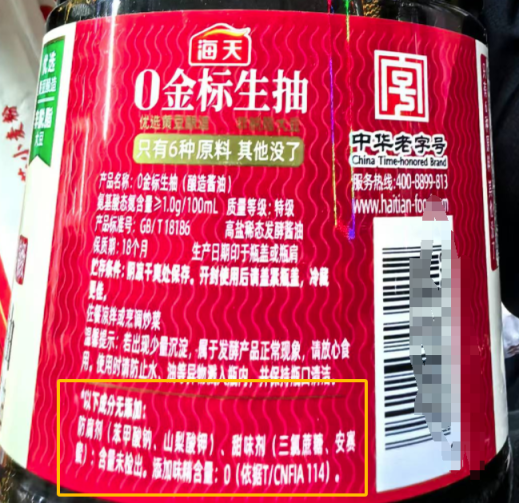 海天一款0金标生抽油标注“零添加”,实际指“以下成分不添加:防腐剂(苯甲酸钠山梨酸钾)、甜味剂(三氯蔗糖、安赛蜜),添加味精含量0”。