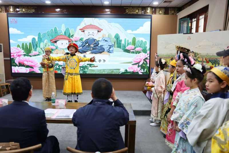 4月20日,圆明园海棠书院大殿,北京市八一学校小学生表演情景剧“四时天伦·圆明园里的家国温度”。新京报记者 浦峰 摄