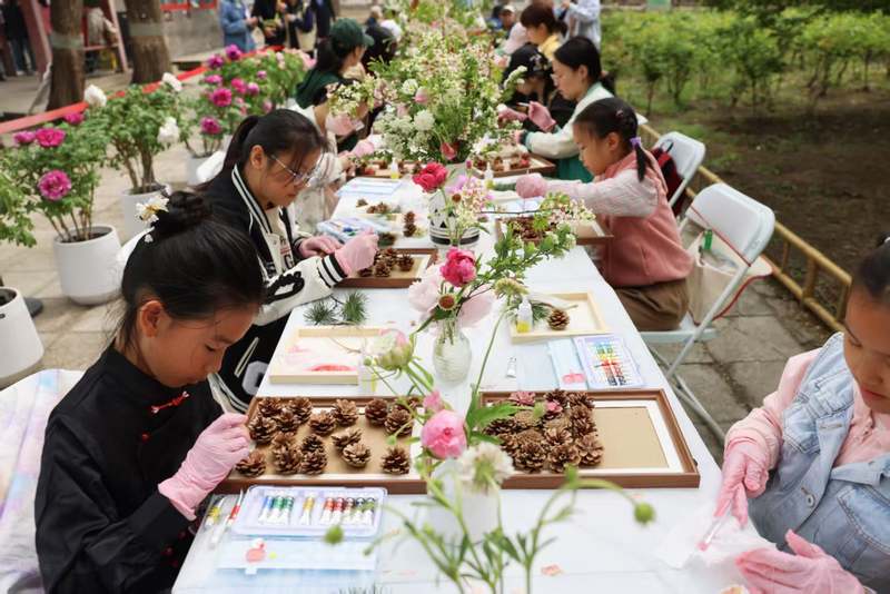 圆明园涵秋馆,小朋友在参加绿色环保松果牡丹花相框DIY手工制作课。新京报记者 浦峰 摄
