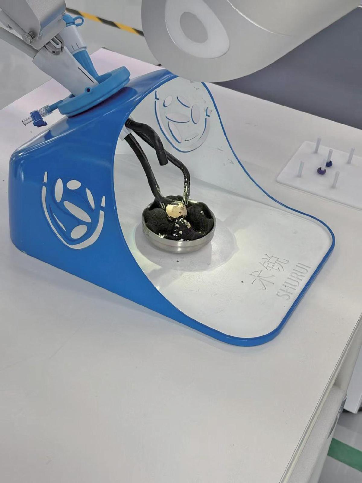 一只“手指”装上内窥镜打着光,另外一只稳稳地撑在鹌鹑蛋那光滑却又无比脆弱的表面,还有两只相互配合,“剥”下小小一片鹌鹑蛋壳。它们相互配合,力度与角度精准把控,每一次移动都像是经过无数次排练。