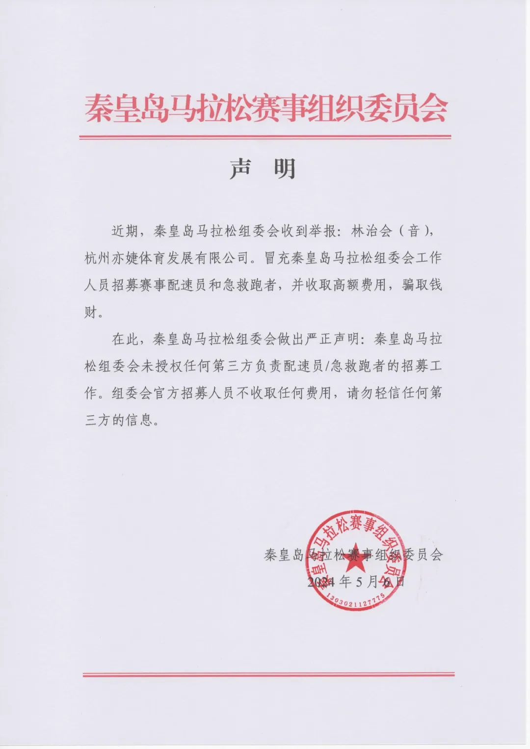 2024年5月,秦皇岛马拉松组委会发布声明。