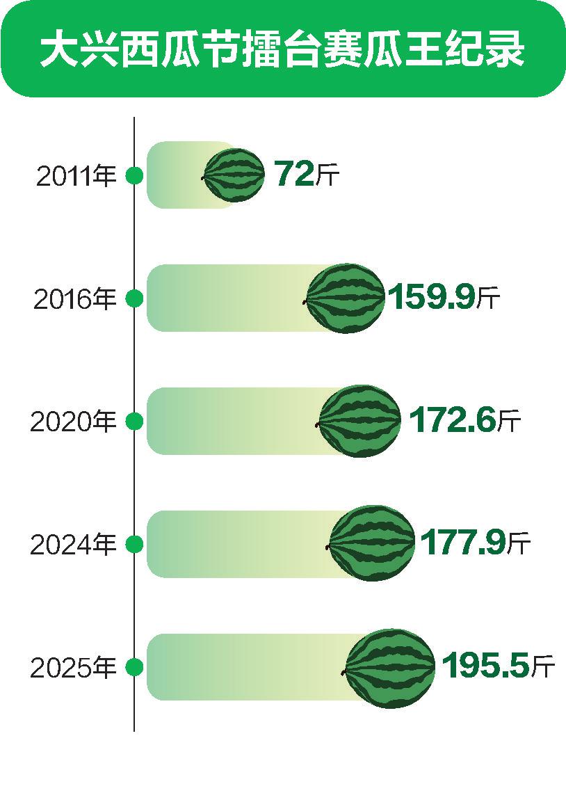 在37年的西瓜擂台赛上,“瓜王”的重量已经发生了巨变。大兴区农业技术推广站芦金生在第36届大兴西瓜节上向记者介绍,早期,农户会挑选自家瓜田里最大的西瓜前来打擂台,当时30多公斤的西瓜就能获得“瓜王”称号(2011年瓜王重36公斤);如今,瓜王的重量已经翻了几番,瓜王需要经过品种选育、栽培技术持续革新等,才能培育而成。