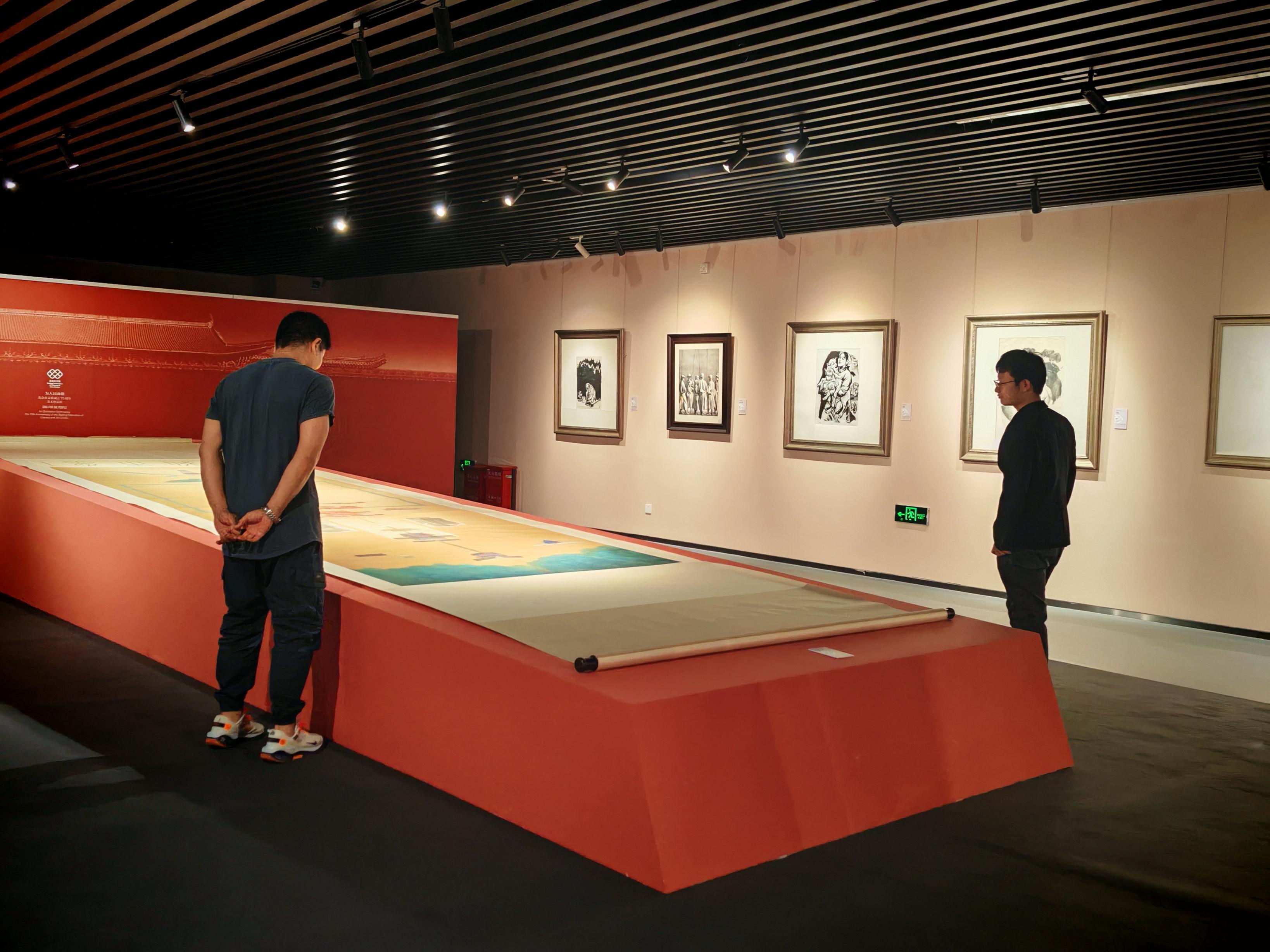 本次美术作品展还呈现出新时代以来北京美术家协会组织的主题性美术创作中的代表性作品,如首次展出的中轴线主题创作《京城之脊》。这幅由中国人民大学教授黄华三领衔创作的巨幅界画,以460×163cm绢本工笔重彩形式,全景式展现中轴线建筑群的雄浑气象,以美术家视角讲好中轴线故事。作品突破传统界画规制,创造性融合散点透视与现代鸟瞰视角,既精准刻画天安门、太庙等核心建筑的营造法式,又通过矿物颜料与金箔贴饰再现“丹楹刻桷”的华彩篇章。