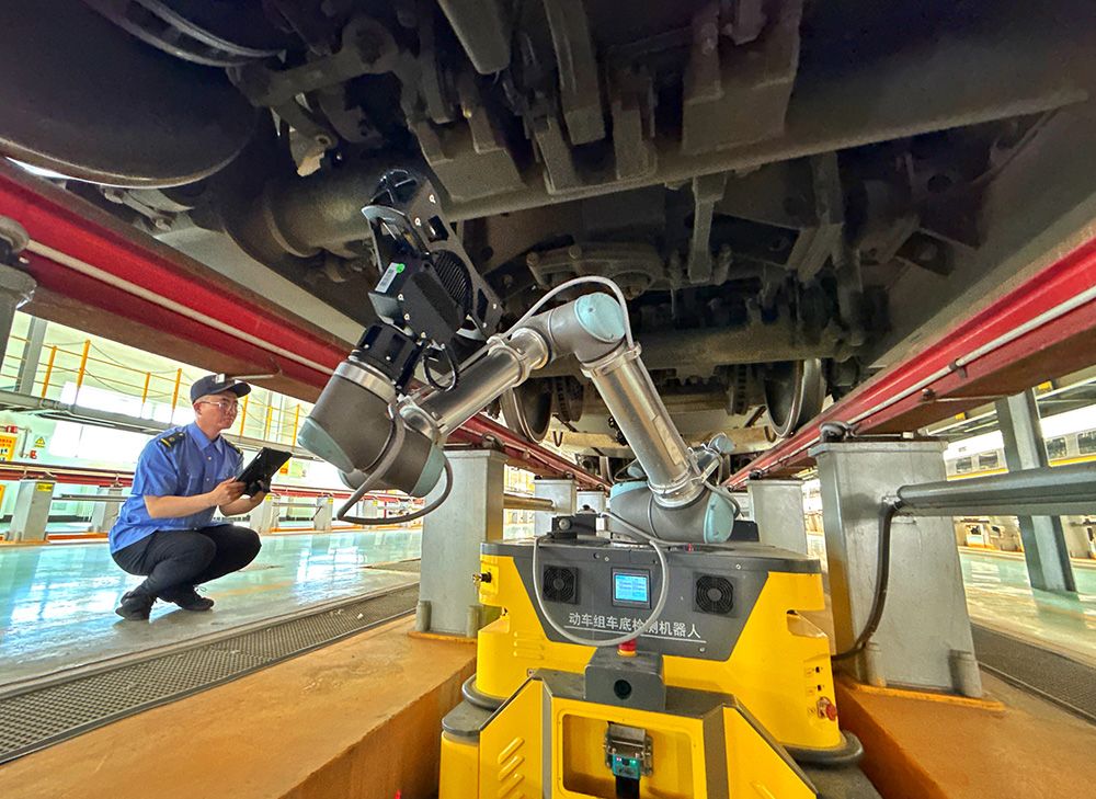 北京动车段北京北所,是京津冀区域内智能化检修作业程度最高的动车所,也是京张高铁动车组检维修基地。6月3日下午,一台动车组车底检测机器人正在工作,为列车的健康状况“问诊”。在工作时,机械臂精准定位部件,高清摄像头快速拍照采集数据,并利用3D处理技术生成图像,这些数据实时传输至服务器,快速诊断出部件状态,一旦发现异常就能够精准标记,并向机械师发出预警。