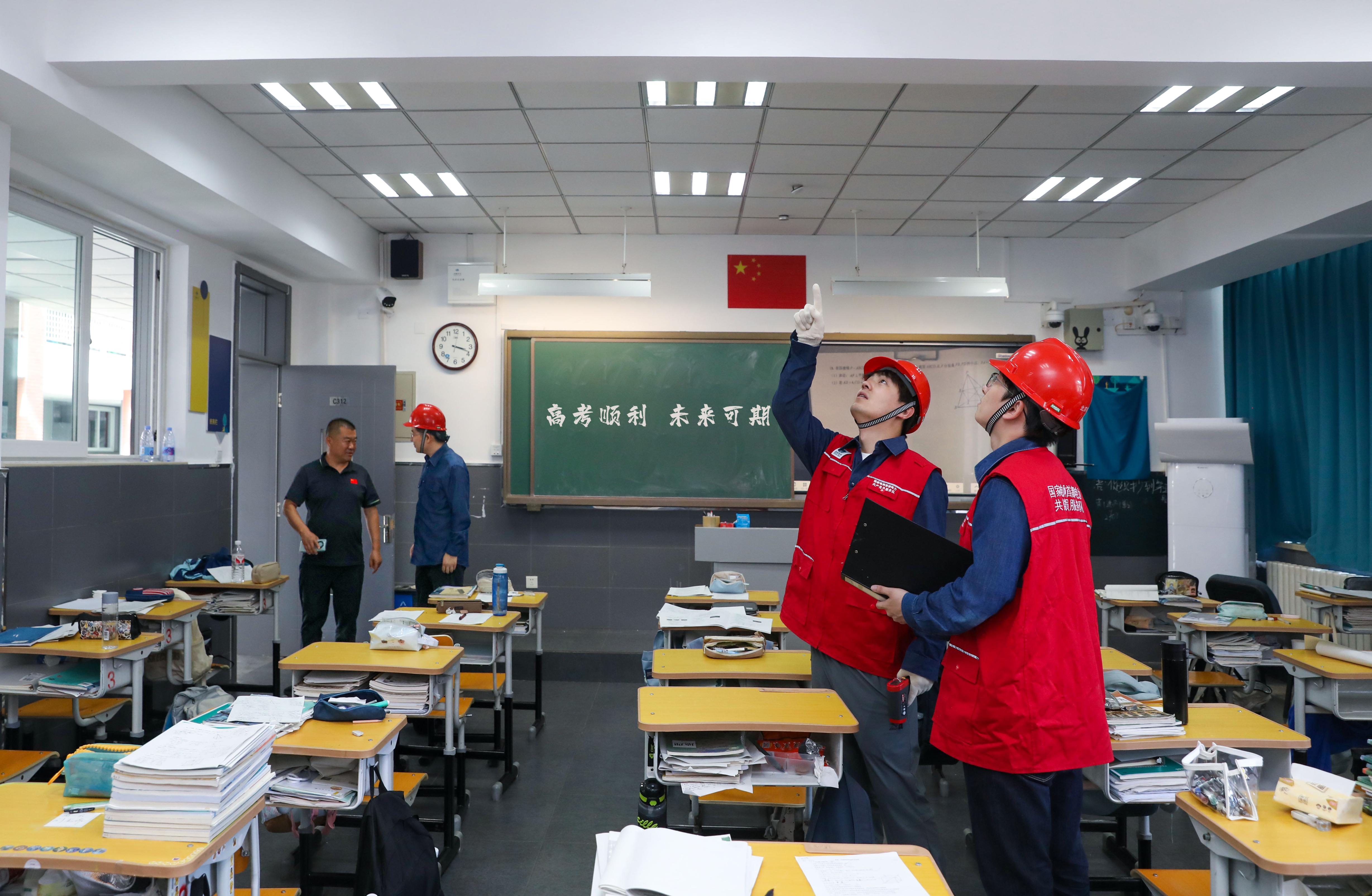 2025年6月4日,国网北京门头沟供电公司高考保障人员罗京、严铭宇在大峪中学高考教室进行用电设备检查,确保高考供电安全可靠。(张文静 摄)