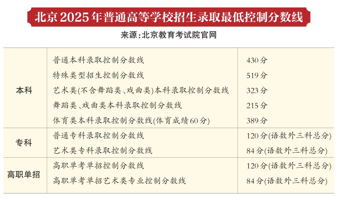 6月25日,北京教育考试院发布北京市2025年普通高等学校招生录取最低控制分数线。普通本科录取控制分数线为430分。同时,2025年北京市高考成绩查询通道和考生分数分布(一分一段)公布。