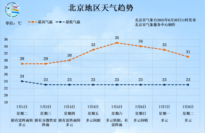 北京市气象台6月30日14时发布:今天(30日)下午阴有分散性雷阵雨或阵雨,南风二三级,最高气温30℃;夜间阴有雷阵雨,南风一二级,最低气温23℃。