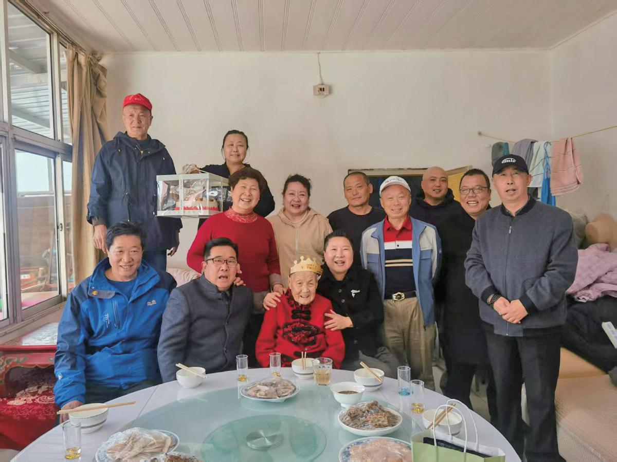 张立英(一排左四)为村里老人庆生。 受访者供图