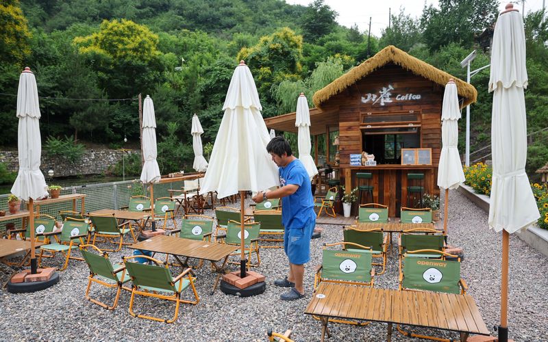门头沟雁翅镇高台村,水塘改成的亲水乐园边上,工作人员在整理服务设施。新京报记者 王子诚 摄