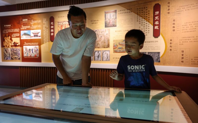 在这里,元曲是贯穿沟域的特色,进入“元曲习研所”,就仿佛跨越百年岁月,走进“元曲世界”。院子里的地上写着各种诗句,元曲研习所的房间里,现代化的光影设备把诗词和戏曲中的故事映照在银幕上,还有各种互动和答题的环节,让游客穿越时光和古人对话。