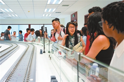 上午11时,参访团走进中关村科技园区丰台园里的中国铁路通信信号股份有限公司,在全球仿真规模最大的列车运行控制系统综合实验室与高铁信号系统动态实验室,近距离观摩中国轨道交通核心技术的研发实力。通过观看英文宣传片与实地参观,学子们深入了解了中国高速铁路系统从追赶到领跑,科技创新实现高水平自立自强的发展成就。“中国的高铁控制系统精密复杂,我很期待下一站坐上高铁去苏州的旅程。中国的建设速度很快,这让我非常期待未来中国会有更大的发展和突破。”加州大学伯克利分校的Norwalk同学说道。