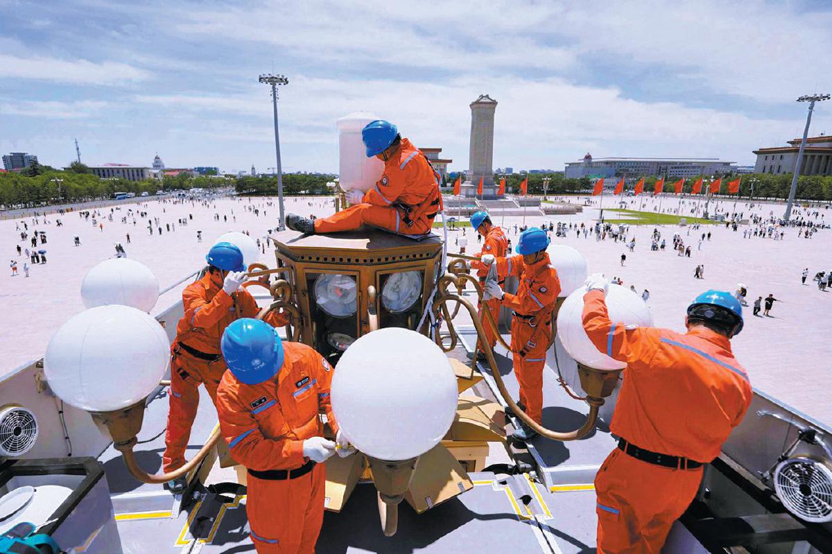 照明管理中心华灯班正在天安门广场开展华灯清扫检修作业。