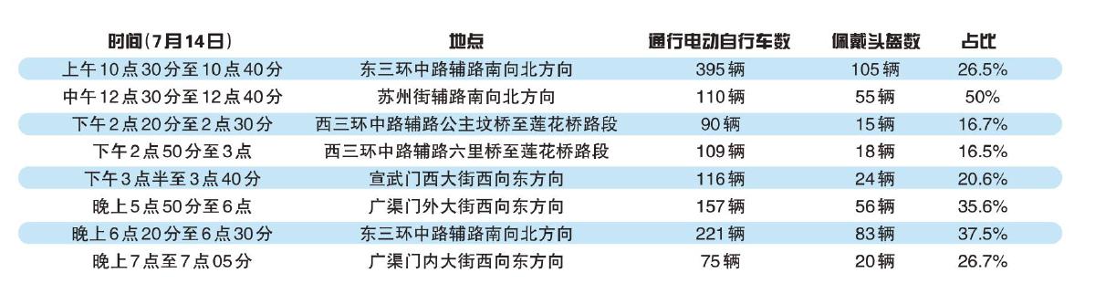 下午2点20分至2点30分间,西三环中路辅路公主坟桥至莲花桥路段,共通行电动自行车90辆,其中骑行者佩戴头盔的有15辆,佩戴比例约为16.7%;下午2点50分至3点间,西三环中路辅路六里桥至莲花桥路段,共通行电动自行车109辆,其中骑行者佩戴头盔的有18辆,佩戴比例约为16.5%;下午3点半至3点40分间,宣武门西大街西向东方向,共通行电动自行车116辆,其中骑行者佩戴头盔的有24辆,佩戴比例约为20.6%。