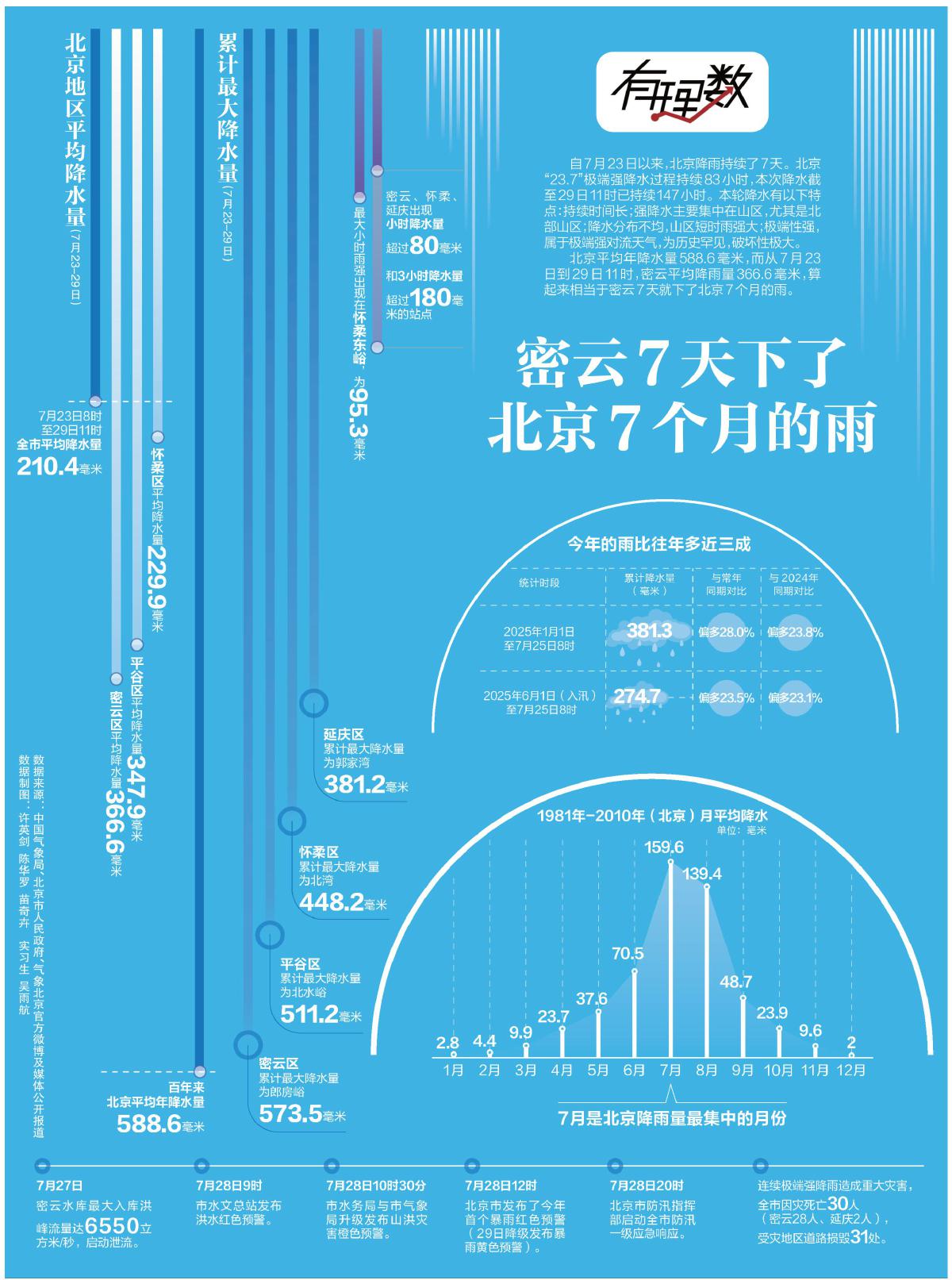 北京平均年降水量588.6毫米,而从7月23日到29日11时,密云平均降雨量366.6毫米,算起来相当于密云7天就下了北京7个月的雨。
