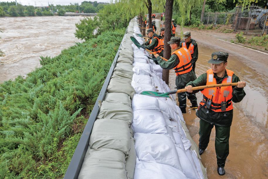7月29日,宁村新桥,武警官兵对堤坝进行加固。