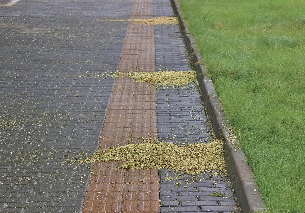 如果连续几天不下雨,国槐的枝条和花序上就会有大量蚜虫,蚜虫分泌的蜜露滴到树下,蜜露本身有较多的糖分,不存在污染和有毒的问题,但行人途经时会觉得脚下比较黏,如果落在车上,也会给车主带来不便。这种情况下,需要环卫工人及时对路面的落花和蜜露进行清洁和清扫。另外,车主光用水冲可能无法洗净蜜露,必要时可以添加洗洁精之类的清洁剂清理车身。