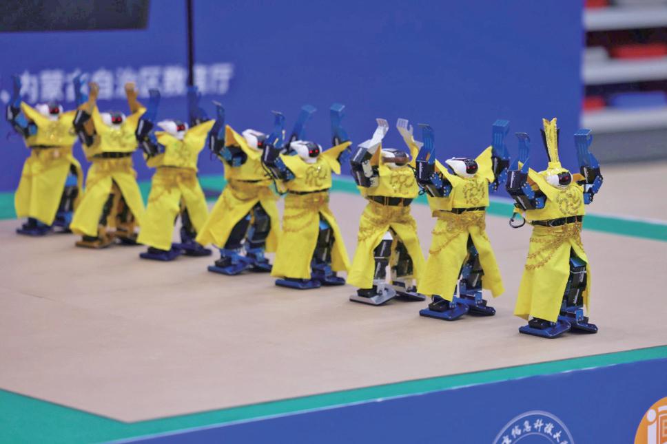 集宁师范学院的“机甲舞动先锋队”由四名机器人舞者组成,它们身穿蒙古族传统服饰,头戴毡帽,中间C位的是“领舞”。随着豪迈的歌声响起,“舞者”们舒展胳膊,每一个关节灵活转动,双腿随着音乐有节奏地摇摆。舞蹈的前半部分动作优美,后半段节奏动感,“领舞”跟随音乐娴熟地转动手中的手绢,增加了舞蹈表演的难度。