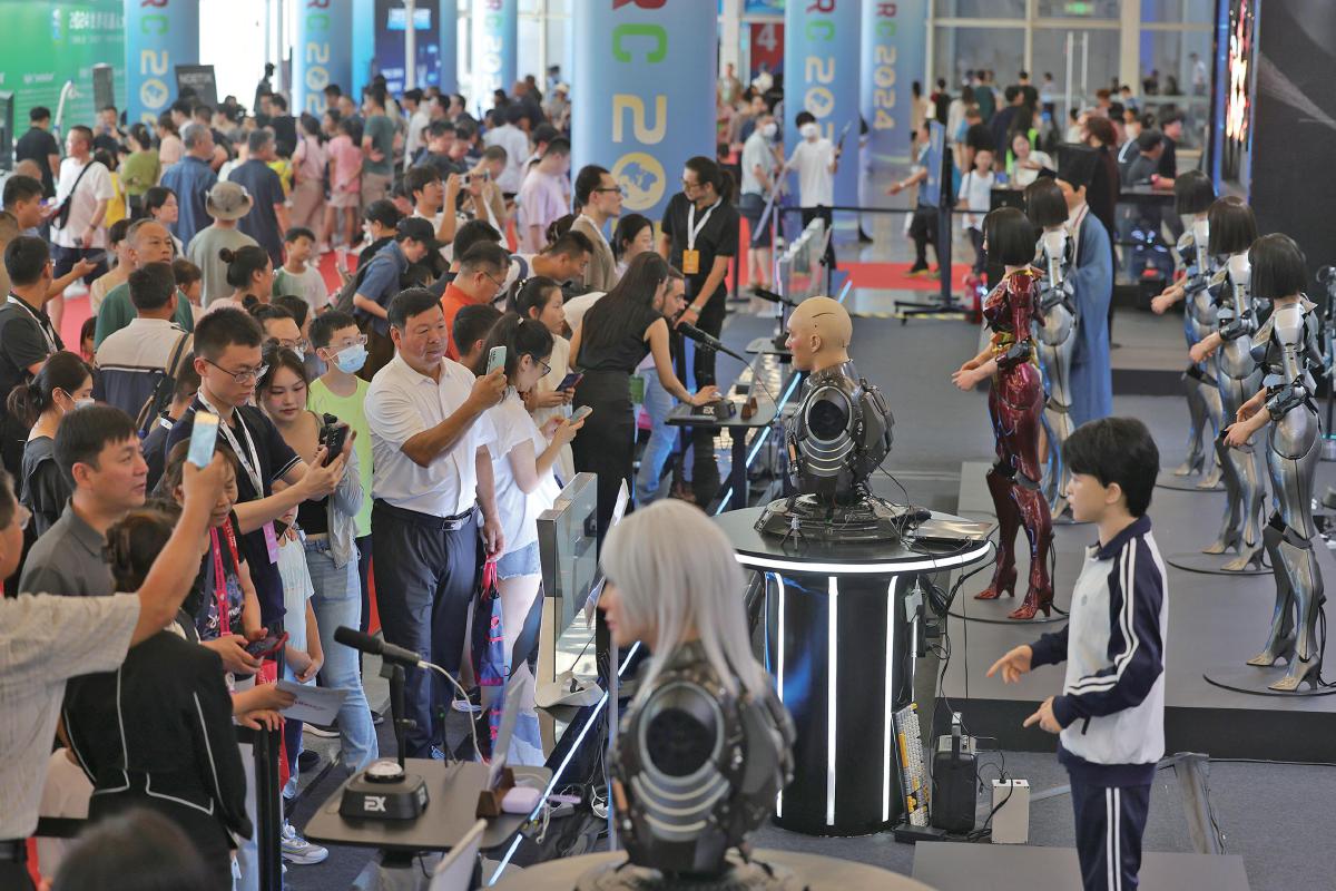 2024年8月22日,2024世界机器人大会机器人博览会,人形机器人展台前观众络绎不绝。 摄影/新京报记者 李木易