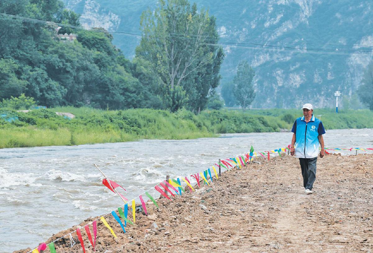 8月4日,门头沟区丁家滩村,村民在永定河边巡逻。 新京报记者 陶冉 摄
